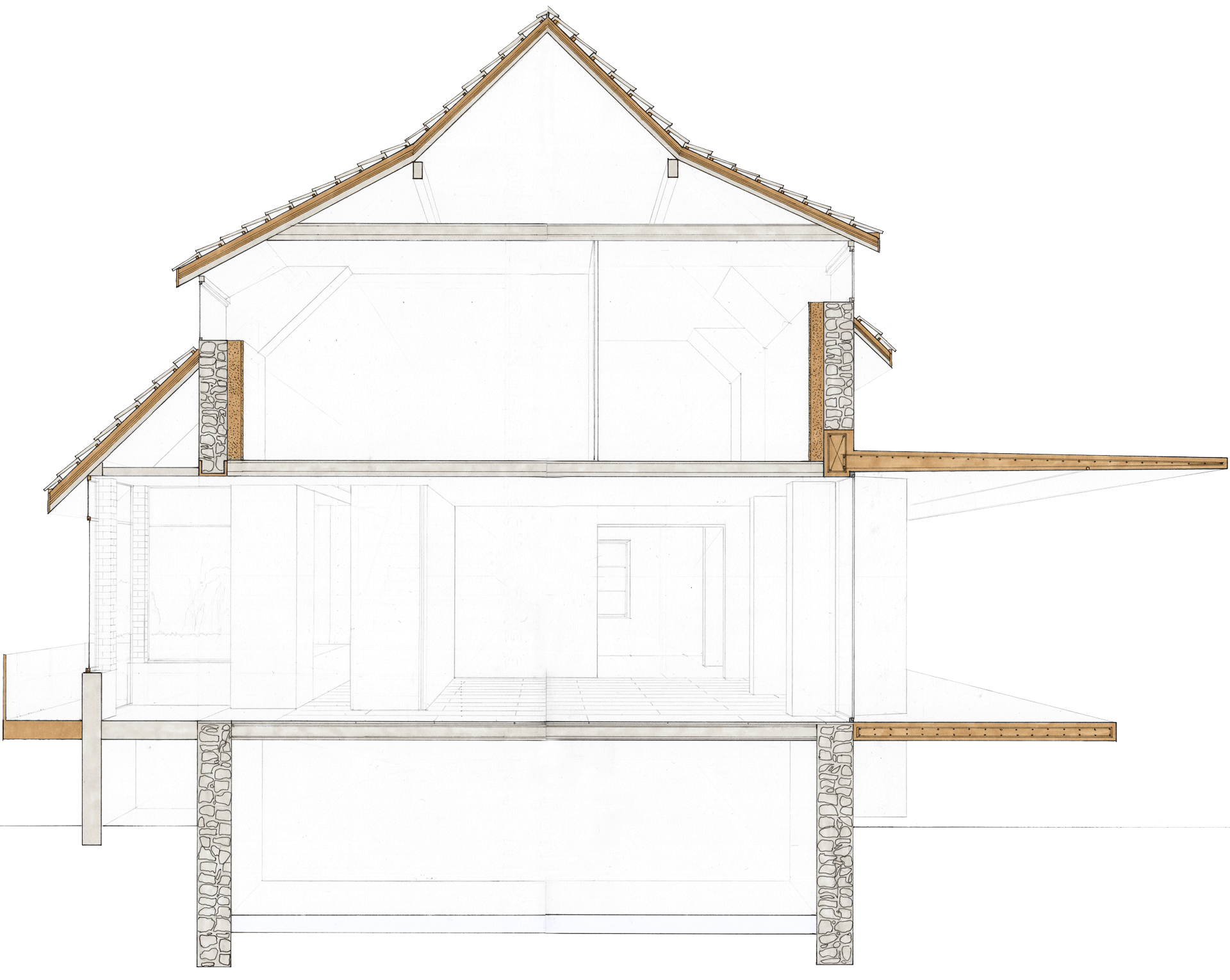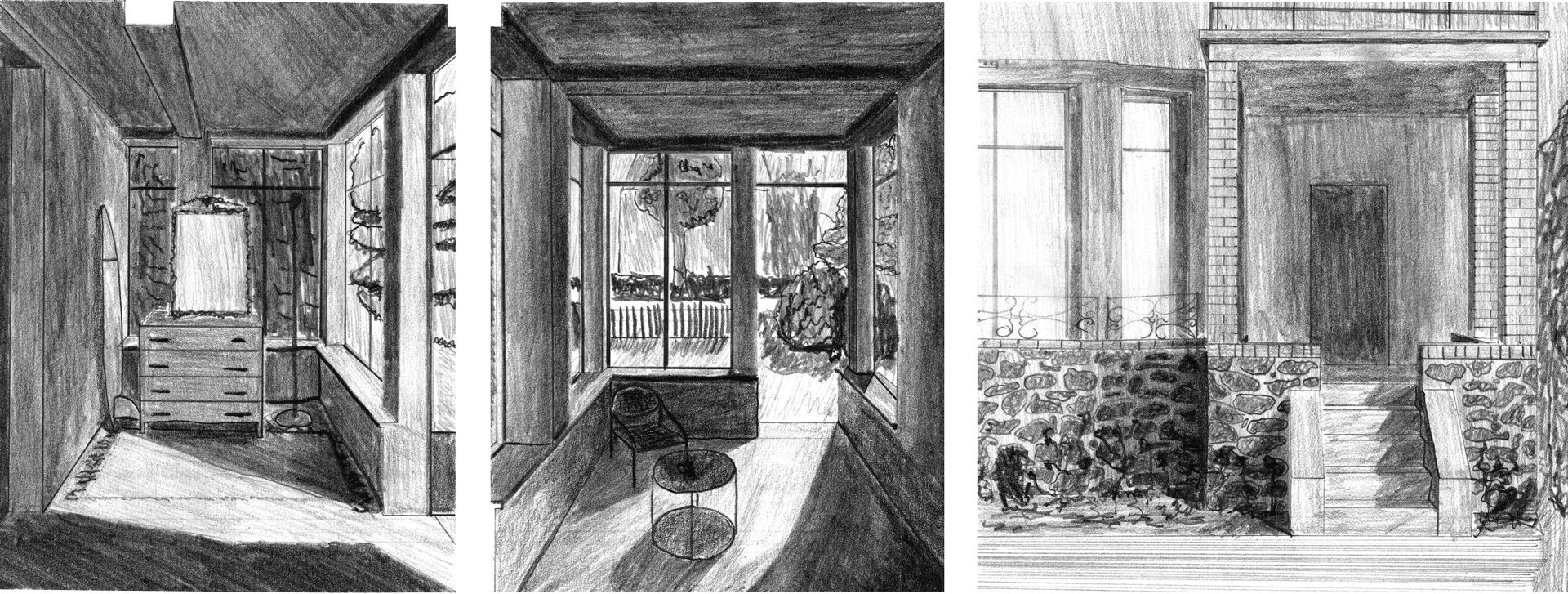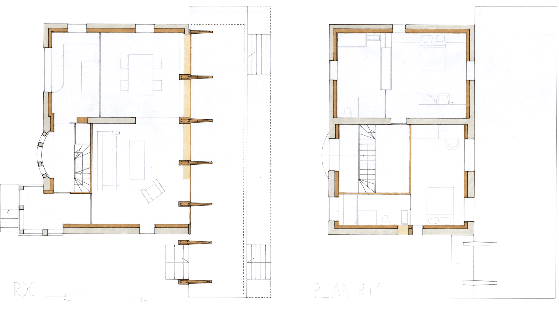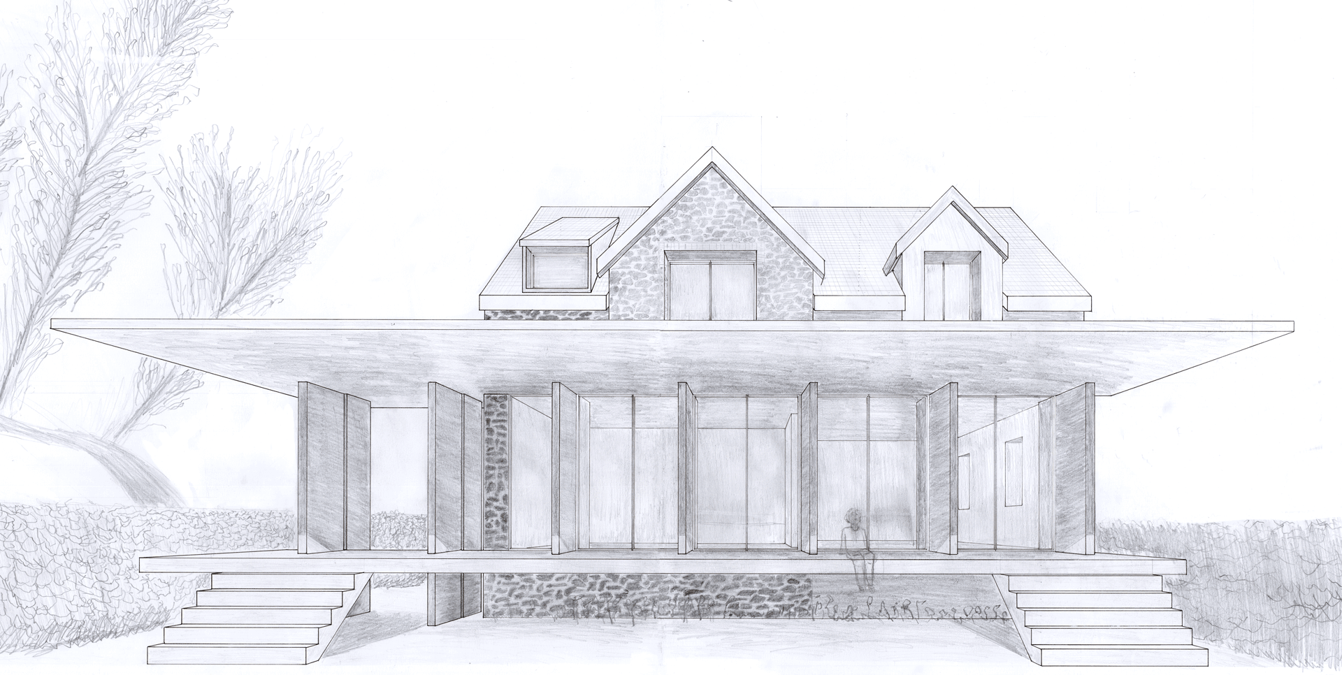 L’étude de la typologie des entrées couvertes permet de déceler le potentiel des espaces entre deux. Ne disposant aujourd’hui, que d’un caractère fonctionnel, de débarrât ou simplement de l’endroit ou on cherche ses clés à l’abri, on propose ici d’articuler l’expérience de la maison autour ce ces espaces délaissés. Protection climatique, ouverture sur l’extérieur et lieu de détente, l’édification du module arrière, sorte de terrasse couverte en miroir de l’entrée couverte, répond aux enjeux contemporains de l’habiter.