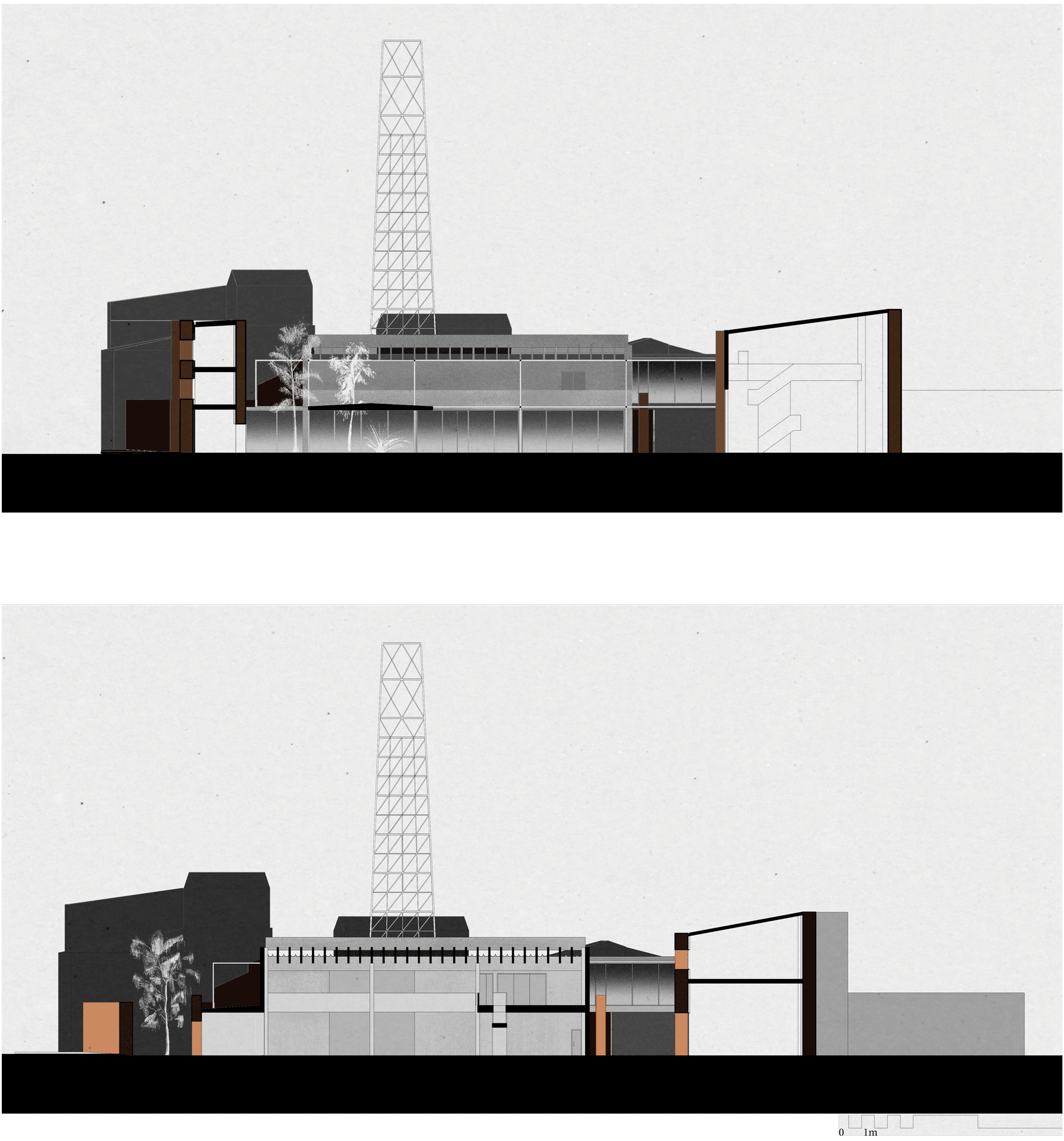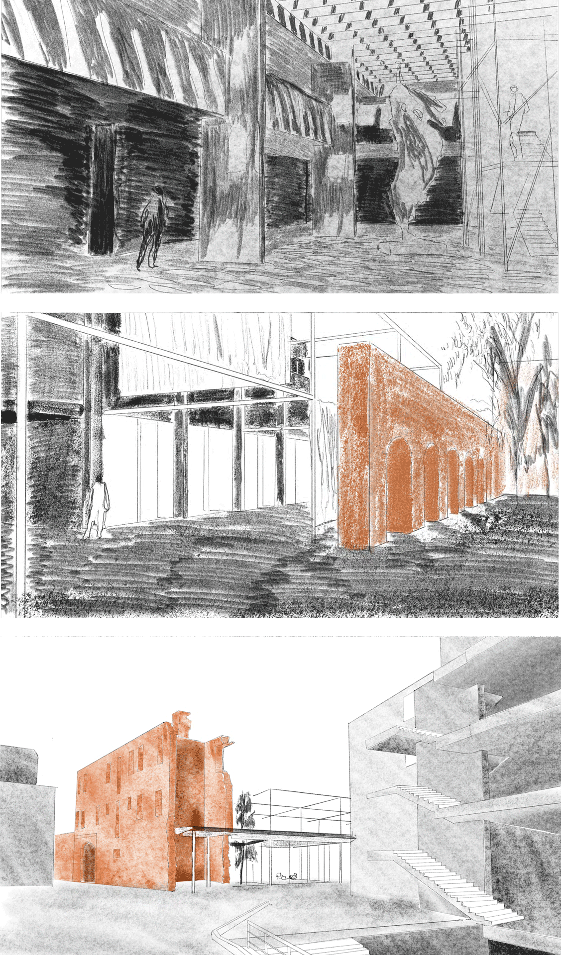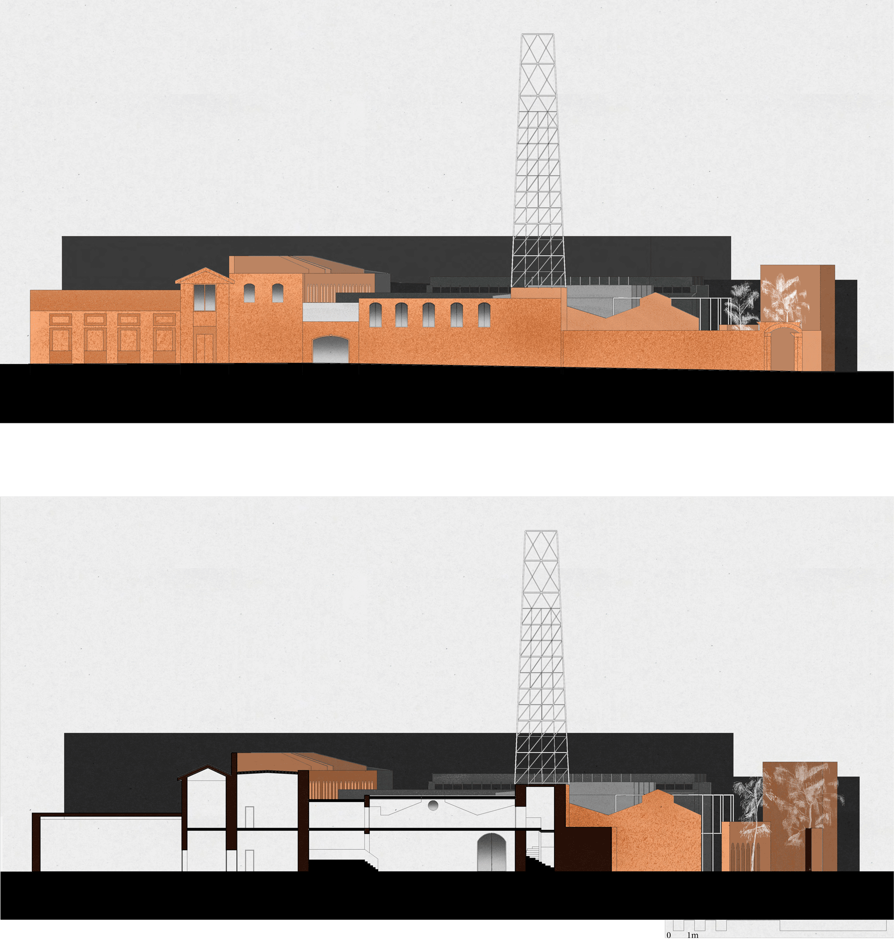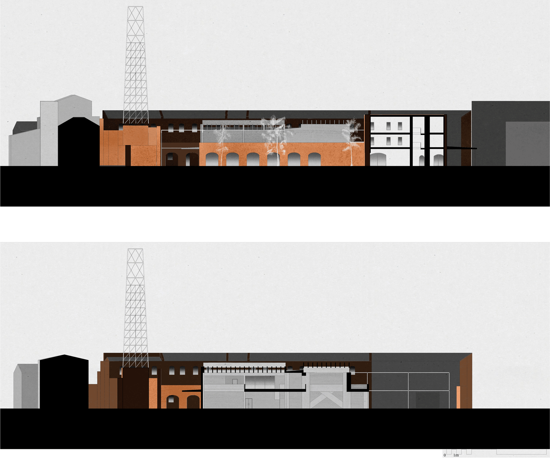 Une résidence d’artisans a été installée dans un ancien moulin en grande partie détruit. Les ruines restent telles quelles, conservées par la consolidation intérieure de la nouvelle structure. La grande cour centrale contient désormais deux structures à la destination volontairement floue : pavillon d’exposition, atelier, espace public et espace événementiel. Construite en béton, cette nouvelle annexe suit le langage industriel préexistant mais se distingue par son traitement monolithique. Une grille tri dimensionnelle construite tel un échafaudage permet une appropriation du lieu, comme une extension qu’il reste a prévoir.