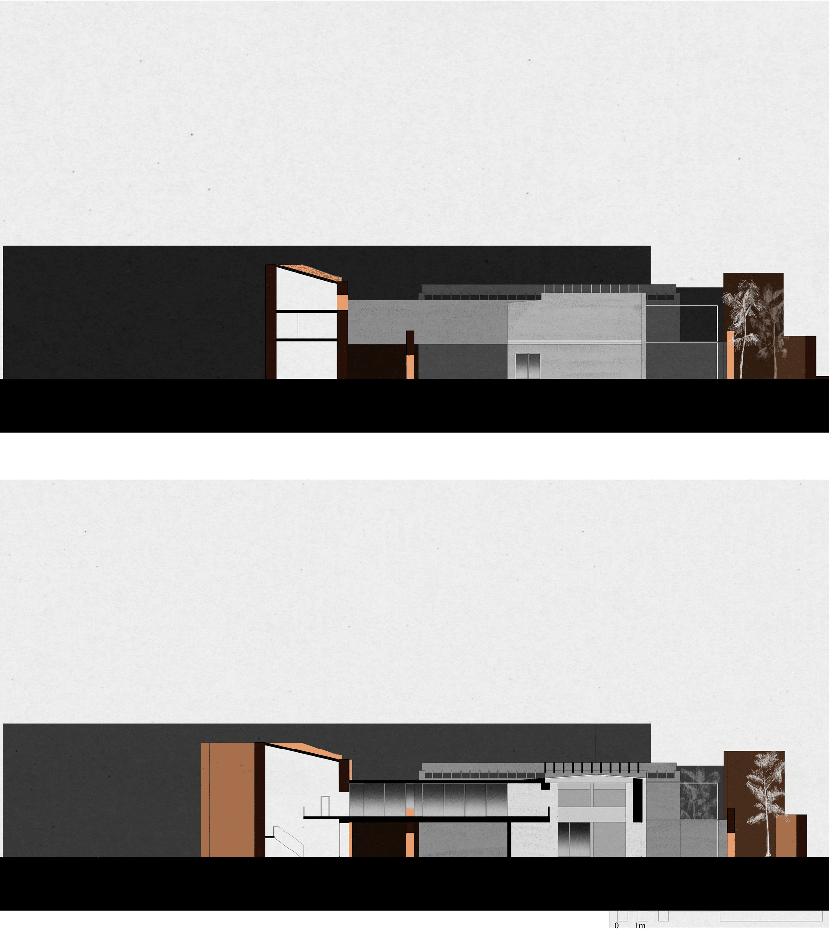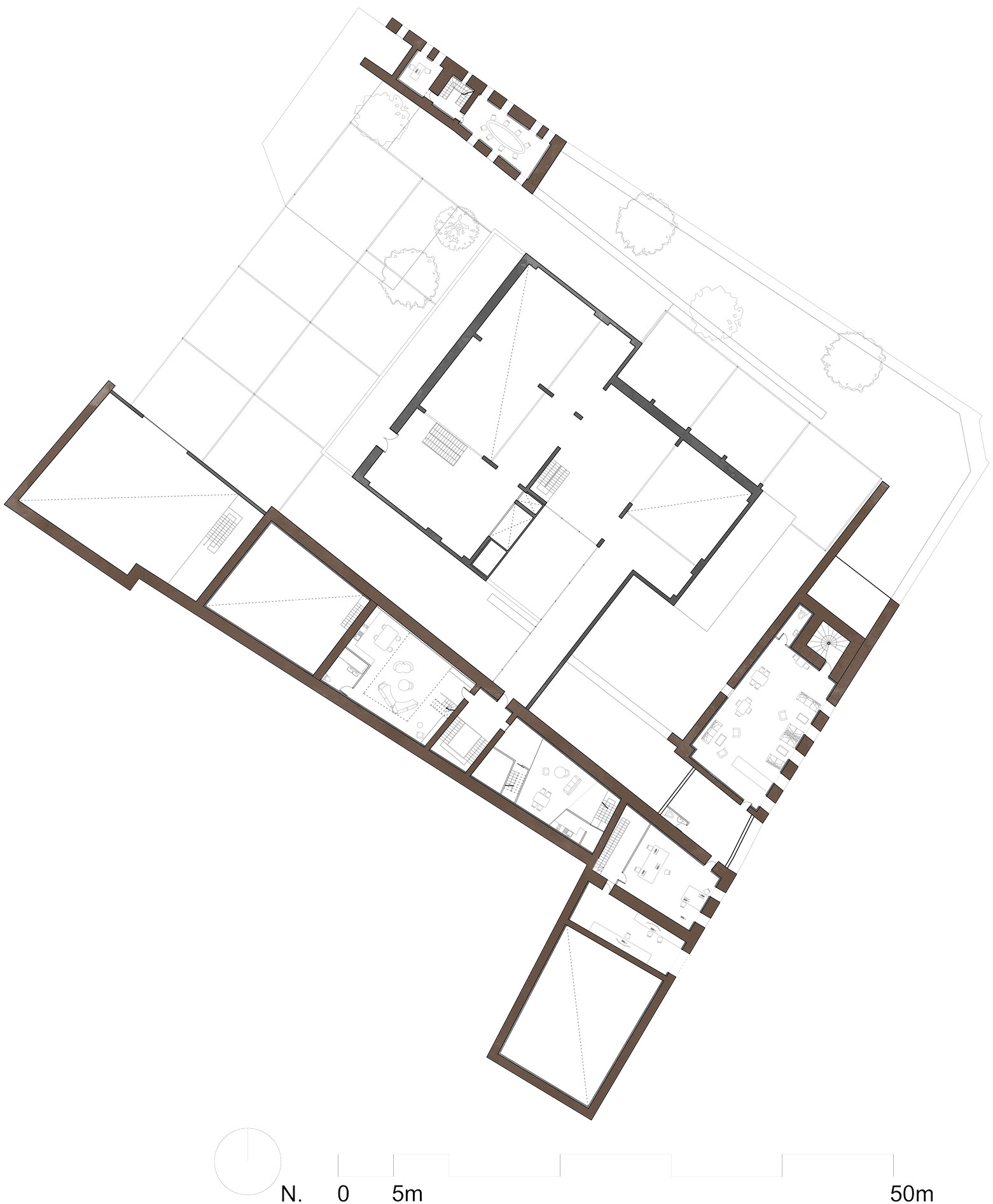An artist's residency has been set up in an old mill that has been largely destroyed. The idea was to leave the original brick buildings as they were, and to build a new metal structure inside them. The large central courtyard is now the home of the site: exhibition pavilion, workshop, public and event space. Built in concrete, this new addition follows the pre-existing industrial language but stands out for its monolithic treatment.